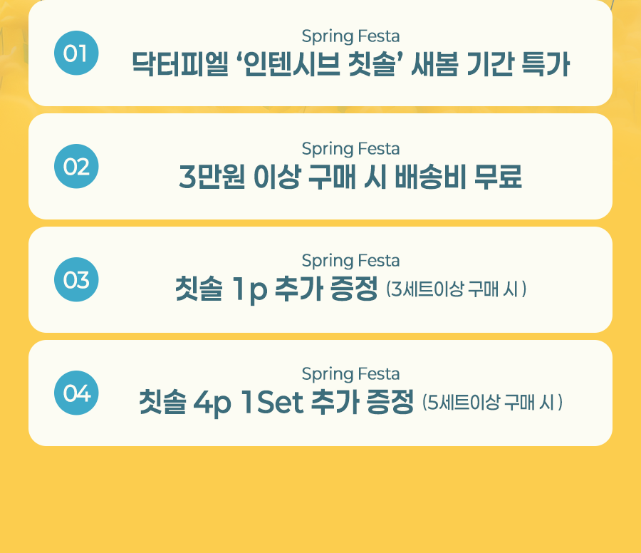| 혜택 4. 5세트 이상 구매 시 칫솔 4p 추가 증정 |